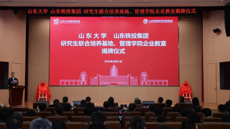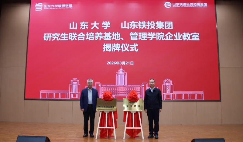 3月21日上午,山東大學(xué)、山東鐵投集團(tuán)研究生聯(lián)合培養(yǎng)基地及管理學(xué)院企業(yè)教室揭牌儀式在濟(jì)南舉辦,旨在深化產(chǎn)教融合、推動(dòng)校企合作,為協(xié)同推進(jìn)人才培養(yǎng)、科研攻關(guān)、成果轉(zhuǎn)化搭建專(zhuān)業(yè)平臺(tái)。山東鐵投集團(tuán)黨委書(shū)記、董事長(zhǎng)王衛(wèi)中,黨委副書(shū)記、董事樂(lè)江華;山東大學(xué)財(cái)務(wù)部部長(zhǎng)路軍偉,管理學(xué)院黨委書(shū)記付巖志、院長(zhǎng)丁榮貴出席儀式。