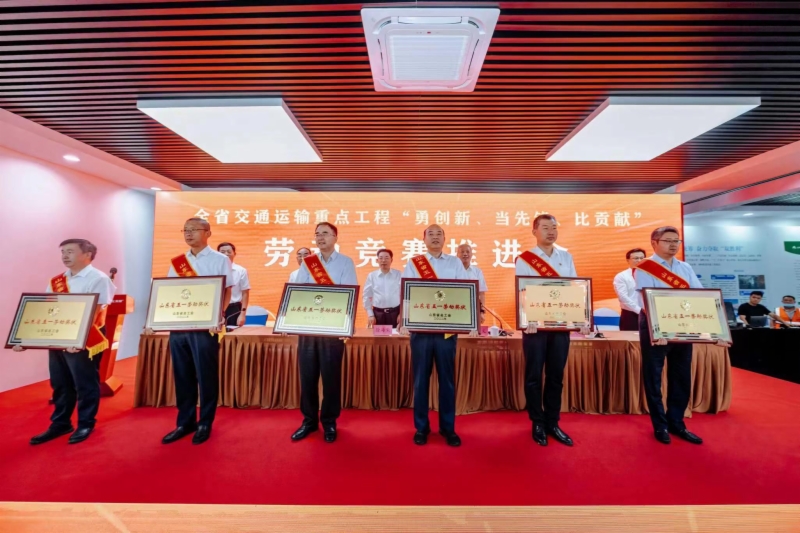 7月6日上午,全省交通運(yùn)輸重點(diǎn)工程“勇創(chuàng)新、當(dāng)先鋒、比貢獻(xiàn)”勞動(dòng)競賽推進(jìn)會(huì)在濟(jì)南市長清區(qū)舉行。集團(tuán)黨委副書記、總經(jīng)理王基全參加大會(huì),并代表集團(tuán)上臺(tái)領(lǐng)取了山東省五一勞動(dòng)獎(jiǎng)狀。