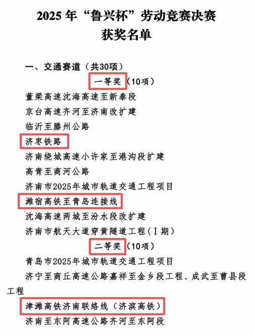 近日,山東省總工會等8部門聯(lián)合印發(fā)了《關(guān)于公布2025年“魯興杯”勞動競賽決賽獲獎名單的通知》,山東鐵投集團(tuán)申報(bào)的5個(gè)交通運(yùn)輸重點(diǎn)工程項(xiàng)目全部獲獎。其中,濟(jì)棗鐵路項(xiàng)目、濰宿高鐵至青島連接線項(xiàng)目榮獲一等獎,津?yàn)H高鐵濟(jì)南聯(lián)絡(luò)線(濟(jì)濱高鐵)項(xiàng)目榮獲二等獎,新建濰坊至煙臺鐵路煙臺南站及動車運(yùn)用所工程項(xiàng)目、龍煙鐵路市域化改造項(xiàng)目榮獲三等獎。
