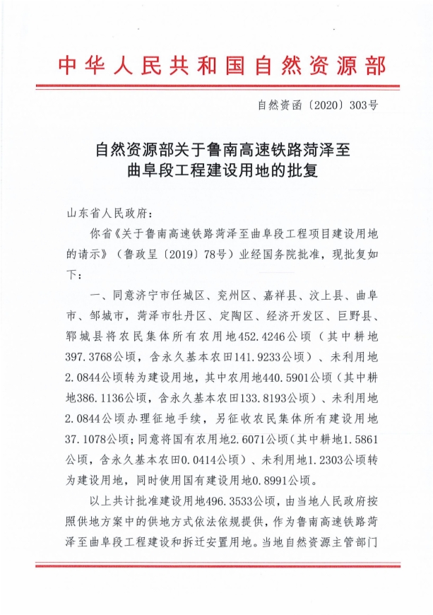 附:《自然資源部關(guān)于魯南高速鐵路菏澤至曲阜段工程建設(shè)用地的批復(fù)》(自然資函〔2020〕303號(hào))