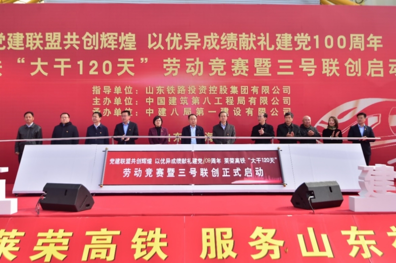 近日,濟青高鐵公司、威海市發(fā)改委、乳山市發(fā)改局、南海新區(qū)經(jīng)發(fā)局、文登區(qū)發(fā)改局,以及中建八局一公司萊榮高鐵項目部,在萊榮高鐵開展“黨建聯(lián)建共創(chuàng)輝煌 以優(yōu)異成績獻禮建黨100周年”勞動競賽暨“三號”(黨員先鋒號、工人先鋒號、青年文明號)聯(lián)創(chuàng)、黨建聯(lián)盟啟動儀式,結(jié)合日前開展的“大干120天,喜迎建黨100周年”勞動競賽,萊榮高鐵建設(shè)按下“加速”鍵。