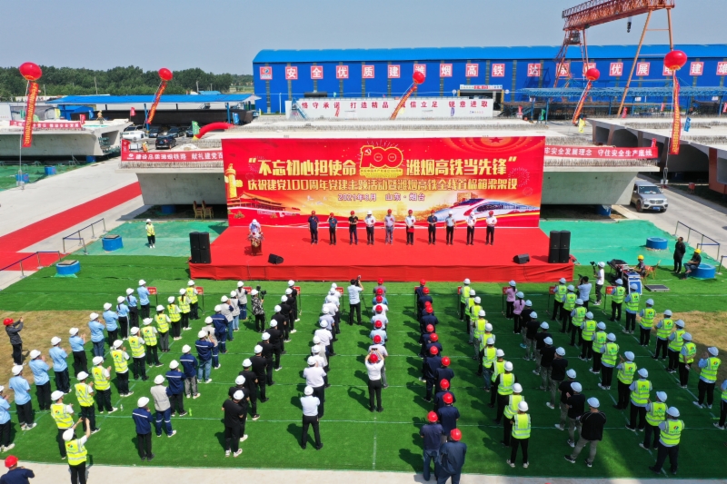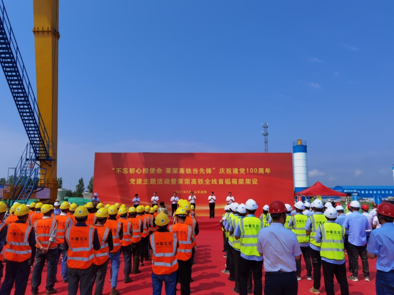 6月26日,山東重點鐵路工程項目濰煙高鐵、萊榮高鐵在煙臺和威海兩地同時舉行慶祝建黨100周年黨建主題活動暨首榀箱梁架設(shè)活動。