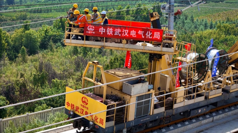 接觸導線直接承擔著為列車提供強大電力來源的重任,列車通過受電弓從接觸網(wǎng)上直接取電,獲得行駛動力。濰煙高鐵需架設接觸網(wǎng)629.46條公里,在導線架設中,統(tǒng)一采用恒張力放線車施工,確保導線的平直誤差不超過0.1毫米。