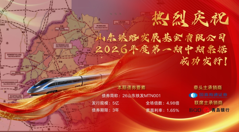 3月13日,山東鐵投集團權(quán)屬山東鐵路發(fā)展基金有限公司2026年度第一期中期票據(jù)(26山東鐵發(fā)MTN001,102680825.IB)成功發(fā)行,本次發(fā)行規(guī)模5億元,期限3年,票面利率1.65%,全場認購倍數(shù)4.98倍。該利率不僅刷新公司直接融資票面利率歷史新低,更創(chuàng)下山東省屬企業(yè)同類融資產(chǎn)品利率新低。