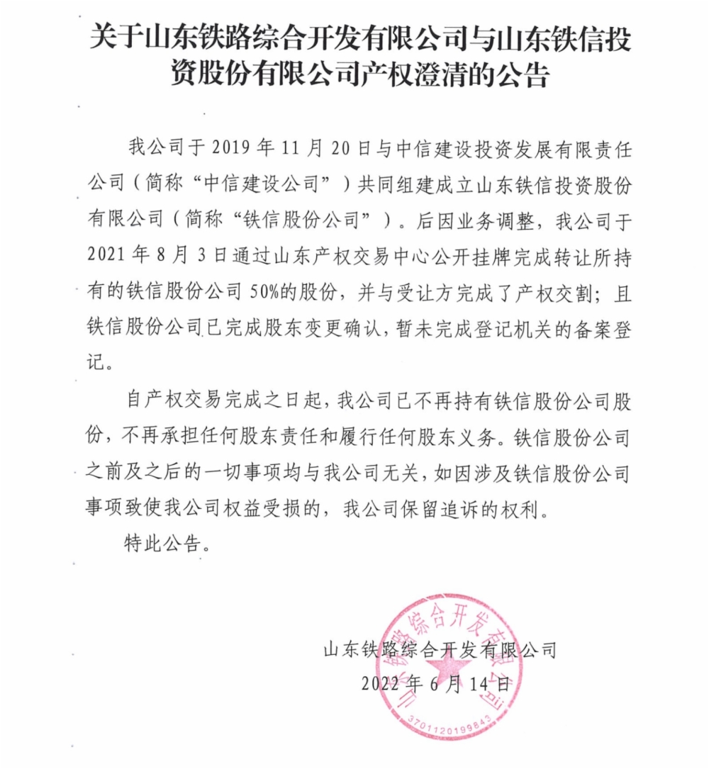 關(guān)于山東鐵路綜合開(kāi)發(fā)有限公司與山東鐵信投資股份有限公司產(chǎn)權(quán)澄清的公告