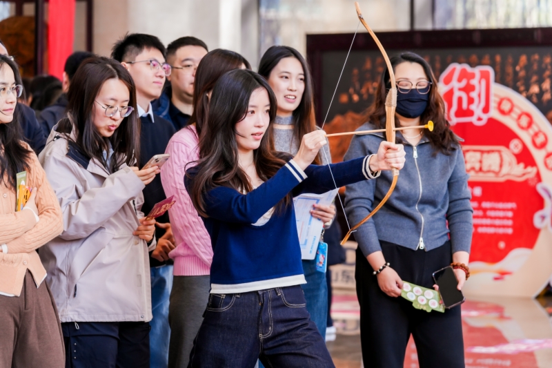 活動(dòng)現(xiàn)場(chǎng)分為“君子六藝”游戲挑戰(zhàn)區(qū)與民俗集市區(qū)兩大板塊,東西兩側(cè)大廳功能鮮明、熱鬧非凡。游戲挑戰(zhàn)區(qū)設(shè)置了“禮、樂(lè)、射、御、書、數(shù)”即猜燈謎、聽曲識(shí)歌、扔沙包、射箭等6個(gè)趣味互動(dòng)節(jié)目,廣大職工憑借通關(guān)卡參加趣味活動(dòng),每通一關(guān)可獲得一枚印章、相應(yīng)印章可兌換50貫“交子”,用“交子”在集市上購(gòu)買心儀年貨。