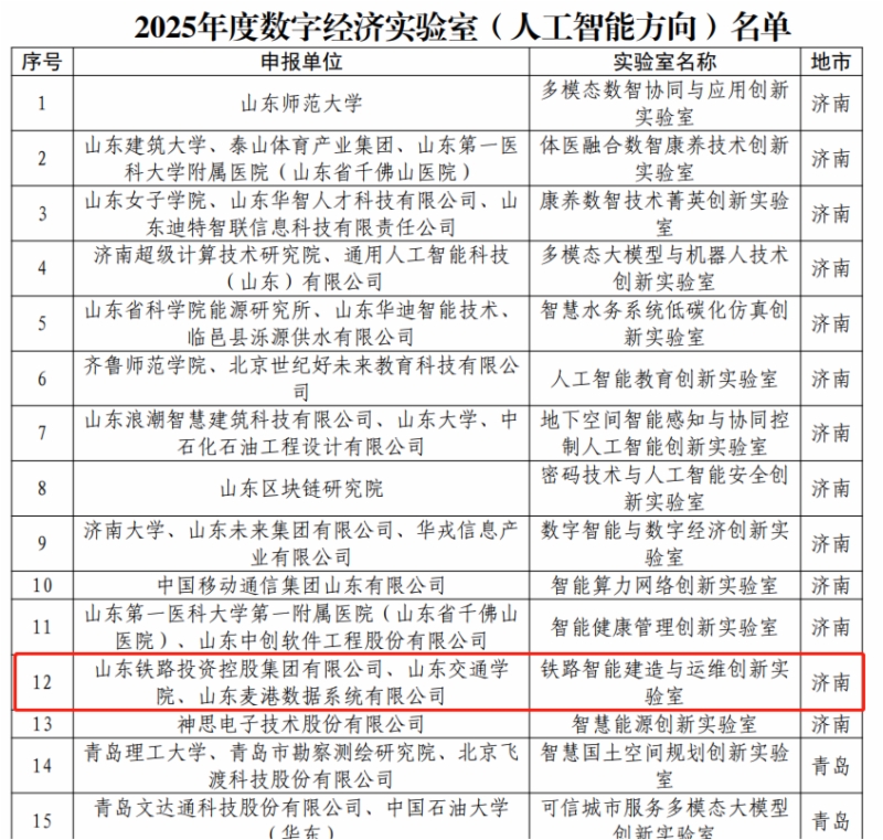 日前,山東省工業(yè)和信息化廳公布了2025年度山東數(shù)字經(jīng)濟創(chuàng)新平臺名單,集團牽頭申報的“鐵路智能建造與運維創(chuàng)新實驗室(人工智能方向)”成功入選,成為本次25家獲批單位之一,標志著山東鐵投集團在人工智能關(guān)鍵技術(shù)研究與創(chuàng)新應(yīng)用方面邁出了堅實一步。