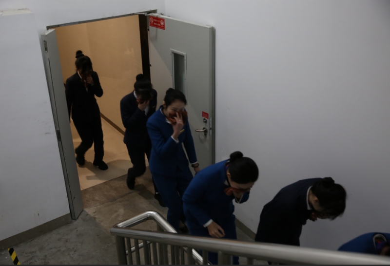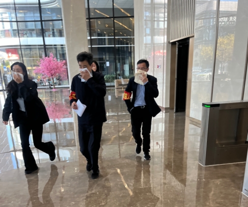 本次演練以2520會(huì)議室為模擬著火點(diǎn),中控室收到煙感報(bào)警后,工作人員迅速確認(rèn)火情,現(xiàn)場(chǎng)指揮立即啟動(dòng)應(yīng)急預(yù)案。滅火組快速穿戴消防服趕赴火場(chǎng),利用滅火器、消防水帶撲救初期火災(zāi);設(shè)備組同步將全部電梯迫降至1樓,保障疏散安全;疏散組按照“向下疏散、應(yīng)下盡下”原則,引導(dǎo)人員用濕毛巾捂住口鼻,沿指定樓梯有序撤離,身體不適人員按樓層就近疏散至避難層;警戒組、救護(hù)組分別做好現(xiàn)場(chǎng)警戒與應(yīng)急救護(hù)準(zhǔn)備。
