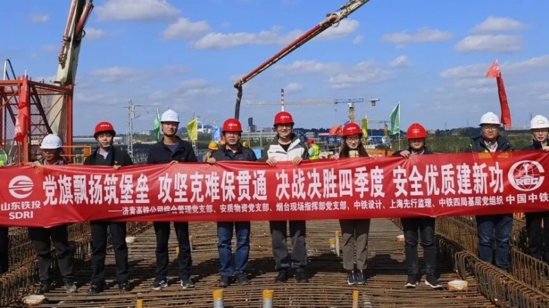 在澆筑現(xiàn)場,煙臺交通“黨建+”共同體還同步開展了“黨旗飄揚筑堡壘 攻堅克難保貫通 決戰(zhàn)決勝四季度 安全優(yōu)質(zhì)建新功”主題黨日活動,各支部黨員代表共同見證連續(xù)梁澆筑過程,從火熱的建設(shè)實踐和攻堅克難的奮斗精神中汲取力量,進一步激發(fā)“建功在一線”的昂揚斗志。