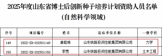 近日,山東省人力資源和社會保障廳公布2025年度山東省博士后創(chuàng)新種子培養(yǎng)計劃入選名單,山東鐵投集團(tuán)博士后姜能棟、李寬成功入選,這是集團(tuán)在高層次創(chuàng)新人才培養(yǎng)方面取得的又一重要突破。