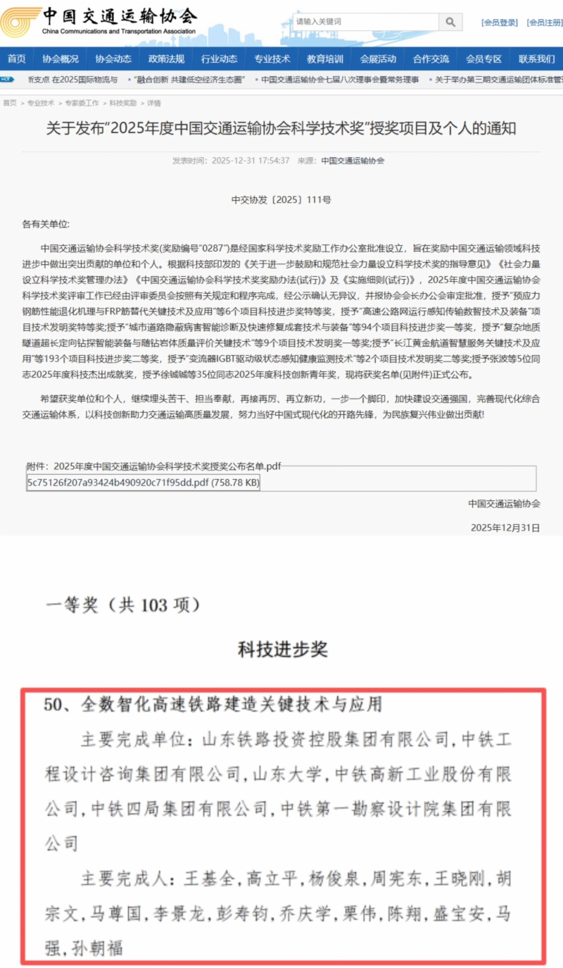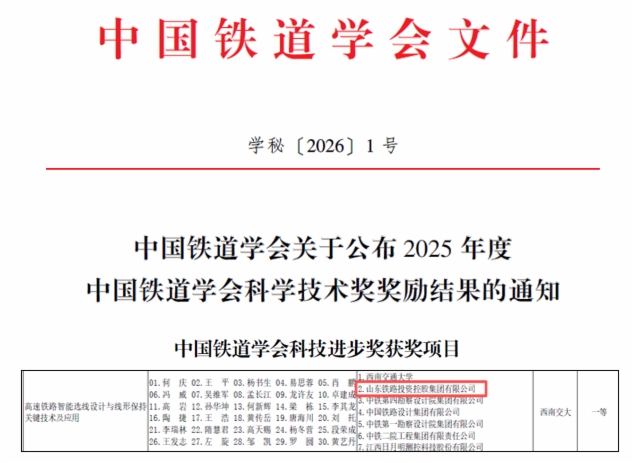 近日,2025年度中國(guó)交通運(yùn)輸協(xié)會(huì)科學(xué)技術(shù)獎(jiǎng)和中國(guó)鐵道學(xué)會(huì)科學(xué)技術(shù)獎(jiǎng)評(píng)選結(jié)果正式公布。山東鐵投集團(tuán)牽頭研發(fā)的“全數(shù)智化高速鐵路建造關(guān)鍵技術(shù)與應(yīng)用”項(xiàng)目榮獲中國(guó)交通運(yùn)輸協(xié)會(huì)科技進(jìn)步獎(jiǎng)一等獎(jiǎng),聯(lián)合研發(fā)的“高速鐵路智能選線設(shè)計(jì)與線形保持關(guān)鍵技術(shù)及應(yīng)用”成果榮獲中國(guó)鐵道學(xué)會(huì)科技進(jìn)步獎(jiǎng)一等獎(jiǎng)。上述兩個(gè)獎(jiǎng)項(xiàng)是國(guó)家科學(xué)技術(shù)獎(jiǎng)勵(lì)工作辦公室批準(zhǔn)設(shè)立的行業(yè)權(quán)威獎(jiǎng)項(xiàng),體現(xiàn)了相關(guān)單位在高速鐵路技術(shù)創(chuàng)新與協(xié)同攻關(guān)方面取得的顯著成績(jī)。